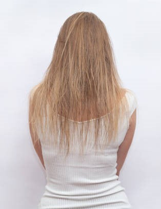 صورة توضح حالة الشعر قبل استخدام الزيت: شعر باهت، ضعيف، متقصف عند الأطراف، ويبدو أنه يفتقر إلى التغذية والترطيب.