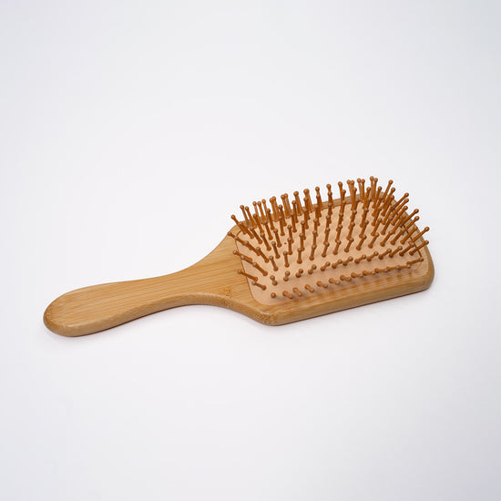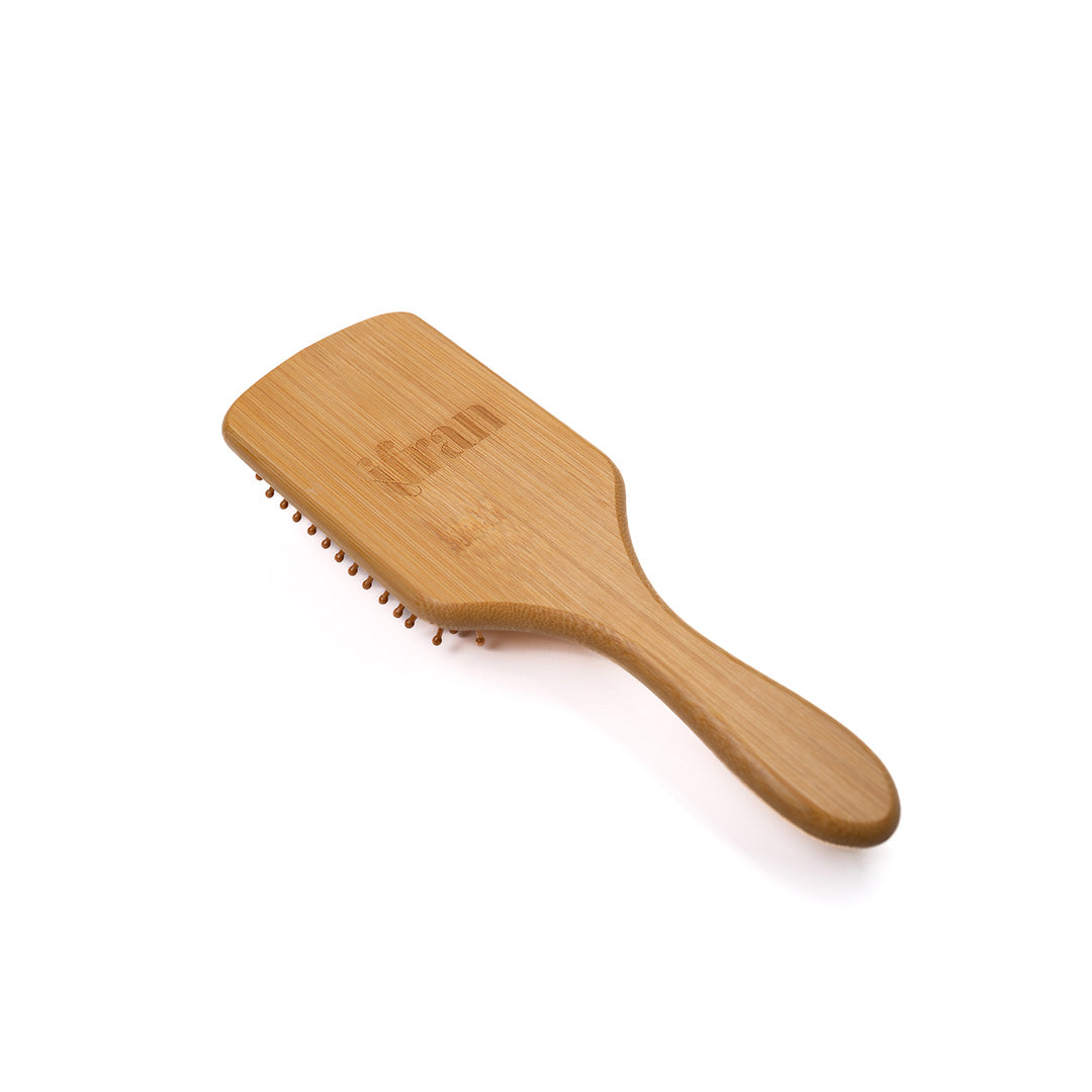 فرشاة شعر صديقة للبيئة مصنوعة من الخيزران، مصممة لفك تشابك الشعر بلطف مع تقليل التكسر وتعزيز صحة فروة الرأس.